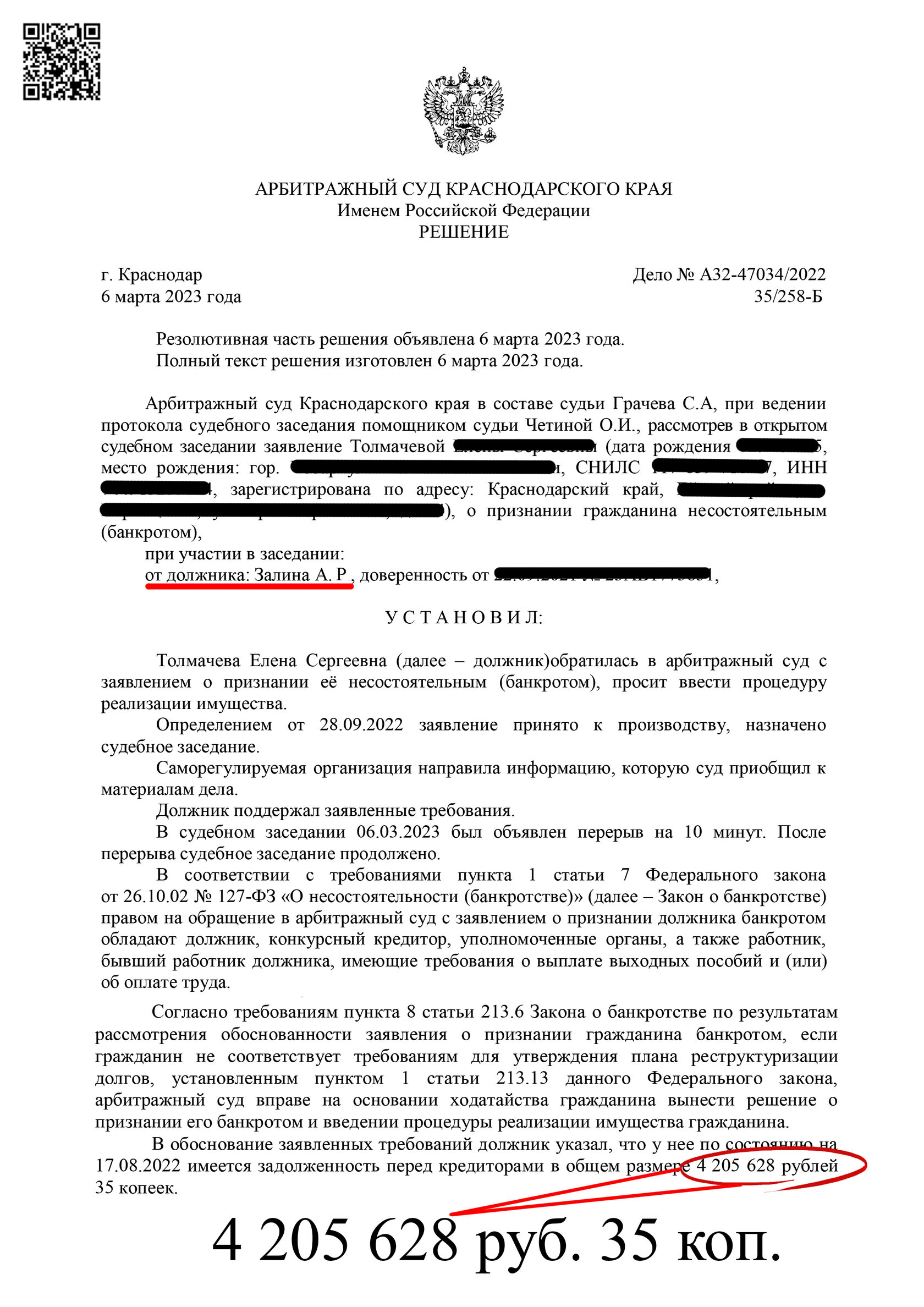 6 марта 2023 года Арбитражный суд Краснодарского края вынес решение о признании несостоятельным (банкротом) моего доверителя, сумма задолженности перед кредиторами которого, составляла 4 205 628 рублей 35 коп.